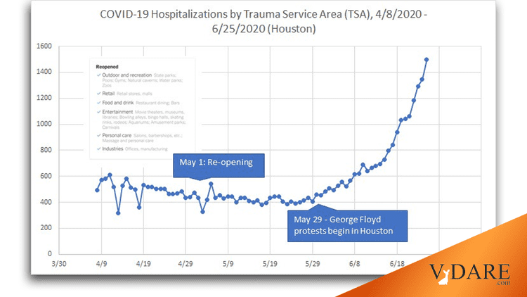 Correlation does not prove causation, as one could say the Memorial Day holiday could've caused the spike. And of course there is an incubation period. However at the least the data does raise the possibility it was the protests that were the more direct cause compared to the re-opening in general. There is anecdotal evidence of positive tests resulting from the protests; see Houston Protesters Begin to Fall Ill With Coronavirus After Marching for George Floyd, by Aila Slisco, Newsweek, June 16, 2020. All the data and information I've found is readily available but of course the "journalists" are too stupid, lazy, and/or biased to dig into it.