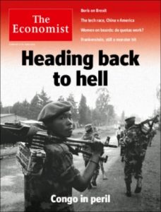 It sucked in soldiers from eight other countries. Mass rape became routine. No one knows how many people died of machete wounds, hunger and disease. Estimates range from 1m to over 5m. Four factors fed the war: an external shock to start it; a state too rotten to hold Congo together; vast mineral wealth that paid for weapons and was worth fighting over; and a tangle of ethnic and tribal grievances for warlords to exploit. [Congo’s war was bloody. It may be about to start again; The Economist, February 15th 2018.]
