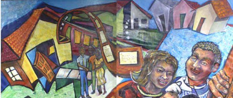 Stepping into the American Dream, 96”x96”, is acrylic and mixed media on canvas. Images in the mural are meant to represent the various avenues through which individuals and families can achieve homeownership — homebuyer education, adequate supply of affordable homes, down payment assistance, and mortgage financing.