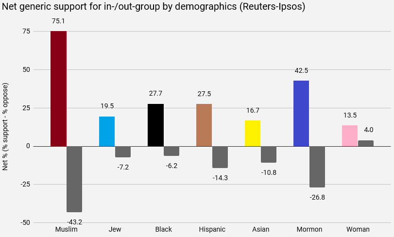 The following graph juxtaposes expressed hypothetical support for a candidate who is X but who is otherwise generic (ie nothing is known about his or her political orientation, partisan affiliation, etc). The first bar for each X, displayed in a color based on my editorial discretion, shows net support (% more likely to support — % less likely to support) among respondents who are themselves X. The second bar for each X, shown in grey, shows net support among respondents who are not themselves X.