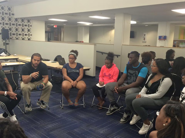 BSU: RCIH leader and 2014 KU alumnus Caleb Stephens leading a discussion on “Am I My Brother or My Sister’s Keeper?” Kynnedi Grant denied that anyone but her was a member of both the BSU and RCIH. And how can Stephens, who is no longer a student, even be eligible to be a member of the Black Student Union? He may well be the de facto leader of the BSU. Picture was posted on the BSU Facebook page on September 22, 2015.[Translation from the racist double-talk: All whites must die, because their mere existence kills blacks. Note that absolutely no one at KU or in the mainstream or campus media has in any way impinged or sought to impinge upon Caleb Stephens’ freedom of speech, or challenged his racist assertions. ]Caleb Stephens: “… and safety and comfort. “We’re all entitled to feel safe, but we’re not all entitled to feel comfortable, especially when your comfort kills other people, whether it’s figuratively or literally. And so, at the end of the day — like, first of all, I don’t have free speech. Let’s just be real with that. We don’t have free speech. Because if we said some of the things people say, we would be, anything, just insert any negative thing that would happen, from getting hate mail to having death threats, things like that, the reality is that if free speech was really free speech this would be a different conversation. But we’re not a part of that.