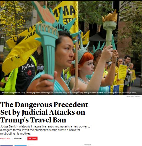 In the Atlantic, Frum has a column called The Dangerous Precedent Set by Judicial Attacks on Trump’s Travel Ban | Judge Derrick Watson’s imaginative reasoning asserts a new power to disregard formal law if the president’s words create a basis for mistrusting his motives, March 16, 2017