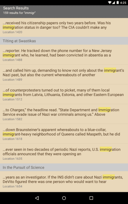 But it doesn’t use the word "immigrant" or "immigration" to describe the process by which they entered the US. Which is odd, because Lichtblau’s book, The Nazis Next Door: How America Became a Safe Haven for Hitler’s Men, uses words starting with "immigr" 159 times. (See a screenshot of that, from my Android tablet.) It must be an instance of the Times’s pro-immigrant bias — if someone is a villain, they must not be described as an immigrant.