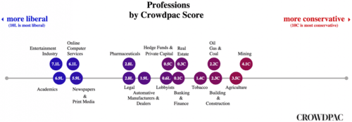 As part of their analysis, Crowdpac is also able to break down where various professions fall on the political spectrum. They provided that data to Business Insider.