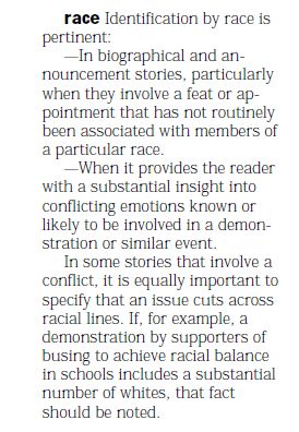 You may know that the Associated Press Style Guide is used by almost all papers in the United States.As we've seen recently in police shootings and the Dylann Roof case, race seems to always be relevant when it makes a white person look bad, never when the person who looks bad is black.Race: Identification by race is pertinent: