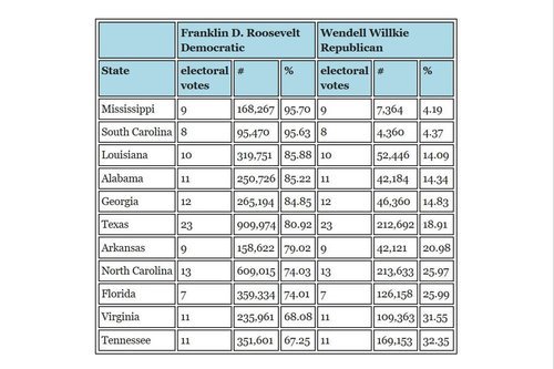 FDR won at least two-thirds of the vote in every old Confederate state, with over 95% in hyper-Confederate South Carolina.