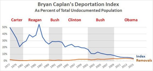 Using Open Borders fanatic Bryan Caplan’s estimate of a "return" (migrants who go home under threat of deportation) as counting for 85% of a full blown "removal" (you are forcibly sent home and face jail time if you return and are caught), Kevin Drum provides an interesting way of looking how our recent presidents handled immigration enforcement.