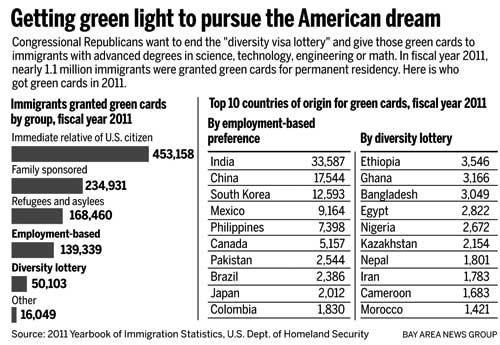 Passage of the visa swap would fulfill a goal of reigning House Republicans to gut the annual "diversity visa lottery," which randomly awards 50,000 green cards for permanent residency to people from countries with low rates of immigration to the United States as long as they have a high school degree.