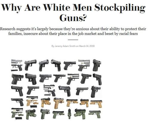 Why Are White Men Stockpiling Guns? — Research suggests it’s largely because they're anxious about their ability to protect their families, insecure about their place in the job market and beset by racial fears, By Jeremy Adam Smith on March 14, 2018